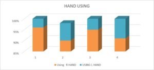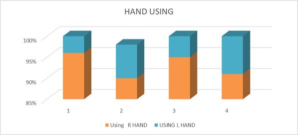 Figure 4 shows the demographic characteristics of the study sample in terms of using the right or left hand in writing. The figure shows that the majority of students use their right hand in writing, with a percentage ranging from 90 to 92%, while the percentage of students who use their left hand ranged from 8 to 10%. Figure 5 shows the demographic characteristics of the four groups from 8 to 10 years old, where the average age ranged from 8.27 to 9.5 years, with a standard deviation ranging from 3 to 5 years, while the BMI ranged from 16.07 to 17.4. Table 2 shows the classification according to the WHO classification of body mass index (BMI) measurement and the Z-SCORE index. There were six levels of classification: very thin, thin, normal weight, overweight, and then obesity [13]. Table 3 shows the classification of students according to the BMI index and the Z-SCORE index for four groups, each group separately, and then for the total sample on which the test and writing skills were conducted. It is clear from the table that the highest index was for the fourth group, reaching 17.4 for the BMI, and the lowest index was 16.07 for the third group, while the Z-SCORE index had the highest value for the second and fourth groups, with a value of 0.64, and the lowest value for the first and third groups, with a value of 0.18. As for the general total, the average BMI index for the total sample was 16.9, which means that most of the children were between the thinness and normal weight limits, while the Z-SCORE index for the total sample was 0.25.